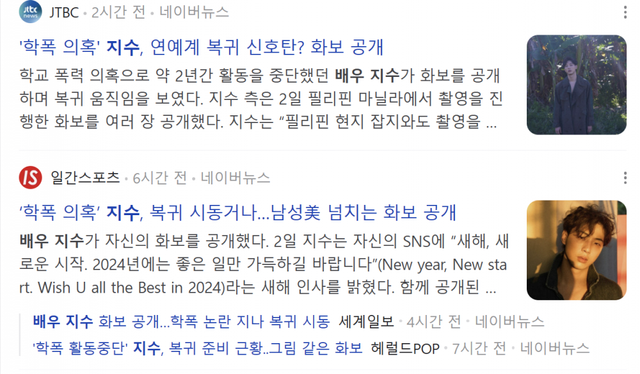 한편, 지수는 작년 10월 군대 전역 소식과 함께 2년 전 불거졌던 학폭 논란에 관련하여 최초 유포자와 오해를 풀었다고 전했다. 또 해당 사건에 대해 다소 과장된 소문에 대한 입장을 밝히며 해명에 나선 바 있다.