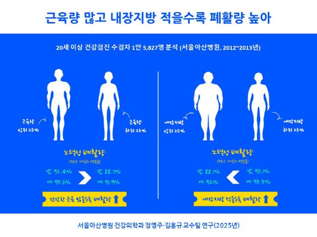 정영주 서울아산병원 건강의학과 교수는 “폐 기능 향상을 위해서는 내장지방을 줄이면서 지방이 적은 건강한 근육을 늘려야 한다. 개개인의 신체구성에 맞는 적절한 운동과 식이관리를 하는 것이 필요하다”고 말했다.