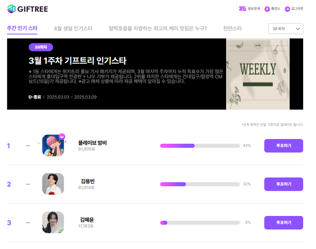 3월 10일부터 진행되는 3월 2주차 기프트리 인기스타에서는 기사를 작성하고 있는 시점을 기준으로 8,420표를 획득한 김용빈이 1위를 차지하고 있으며 그 뒤를 이어 김혜윤이 4,419표, 플레이브 밤비가 4,326표로 각각 2위, 3위를 차지하고 있다.