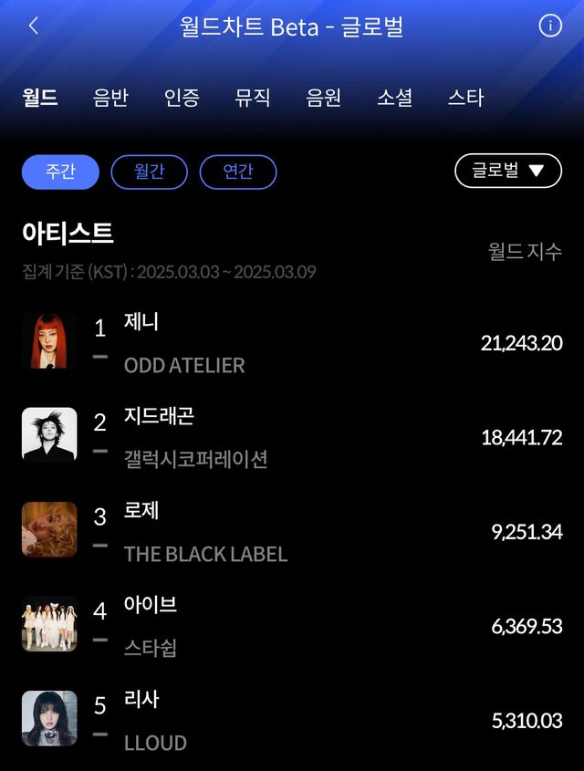주간 월드 차트에서는 제니가 독보적인 글로벌 인기를 과시했다. 제니는 음반과 미디어 부문에서 높은 점수를 획득하며 2만 1243.20점의 월드 지수로 1위를 점했다. 이어 지드래곤이 월드 지수 1만 8441.72점으로 2위, 로제가 월드 지수 9251.34점으로 3위에 자리했다.