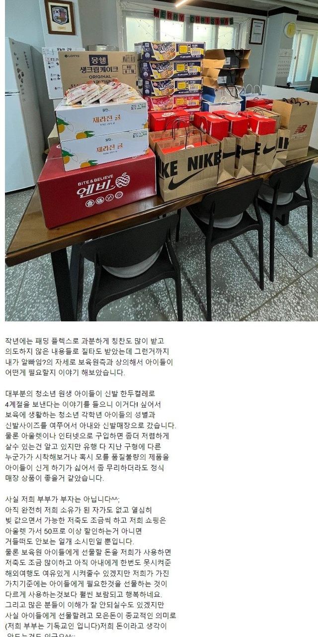 올해에는 보육원에 신발이랑 간식등 왕창 기부하심