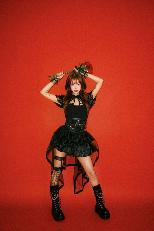 공개된 이미지 속 이바다는 블랙 레이스 미니 드레스와 유니크한 아이템을 착장하고 레드 컬러의 배경 앞에서 과감한 포즈를 취하고 있다.