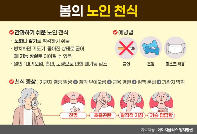 천식은 기관지 염증으로 인해 기도가 좁아지면서 기침, 호흡곤란, 가슴 답답함 등의 증상이 나타나는 만성질환이다. 그러나 노인들은 숨이 차는 증상을 단순한 노화로 여기거나 감기로 오인해 치료 시기를 놓칠 수 있으며 심장 질환이나 만성 폐쇄성 폐질환과 증상이 유사해 정확한 진단이 어려울 수도 있다.