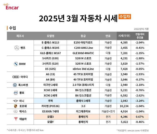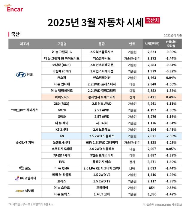 엔카닷컴은 2025년 3월 중고차 시세를 공개했다. 이번에 공개된 중고차 시세는 2022년식 인기 차종 중고차 시세를 분석한 결과다. 주행거리 6만km 미만에 무사고 차량을 대상으로 분석했다.