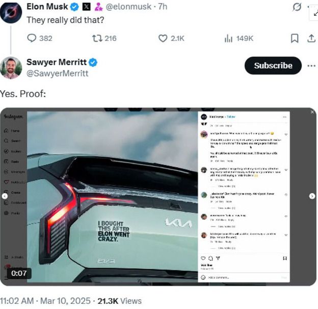 기아 노르웨이 법인은 최근 자사의 전기차 EV3를 소개하는 인스타그램 광고를 게시했다. 광고 속 차량의 범퍼에는 "일론이 이상해진 후 이 차를 샀다(I bought this after Elon went crazy)"라는 문구가 붙어 있었다.