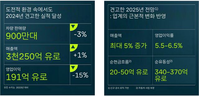 폭스바겐그룹이 11일(현지시간) 발표한 2024년 실적 및 2025년 전망 자료에 따르면 그룹은 지난해 연간 매출액 3247유로를 달성해 전년 대비 약 1.0%(24억유로) 증가했다.