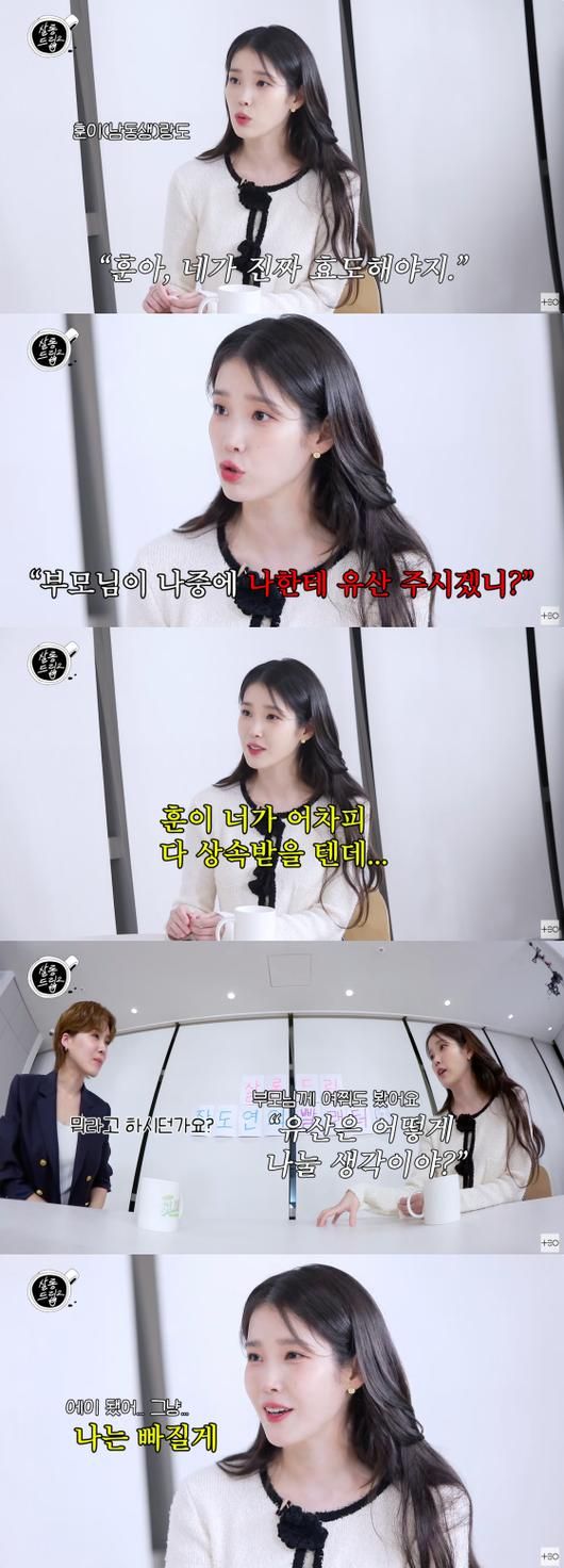 아이유는 "실제로 부모님께 물어본 적이 있다"며 "유산을 어떻게 줄 건지 물었는데 아빠가 '네 명한테 똑같이 준다'고 하셨다"고 전했다. 이에 장도연이 "내가 부모님이라면 내 돈까지 받고 싶냐고 할 것 같다"고 장난스레 말하자, 아이유는 "난 빠지고 내 몫 빼고 1/3로 나누라고 했다"며 웃었다.