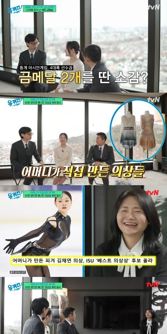 유재석은 "아까도 빙상장에서 뵀지만 어머님이 함께 오셨다. 따님 채현 씨가 우승을 해서 기분도 좋으시겠지만 의상이 많이 화제가 됐다. 이걸 직접 다 디자인하신 거라고 한다. 굉장히 놀랐다"라며 감탄했다.