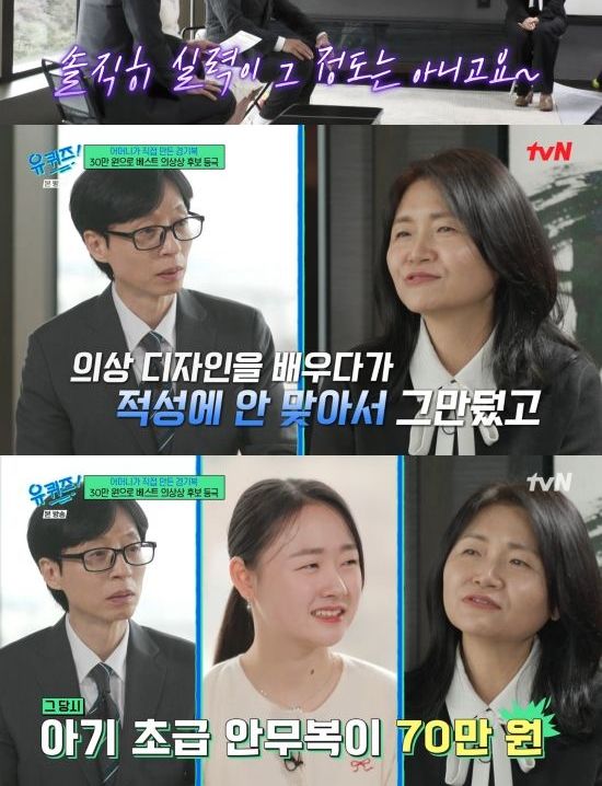 유재석은 가격을 궁금해했고, 이정아 씨는 "아기 초급 안무복이었는데 70만 원이라고 그러더라. 그래서 제가 만들 줄 아니까 '한번 만들어볼까?' 이렇게 해서 시작했다"라며 밝혔다.