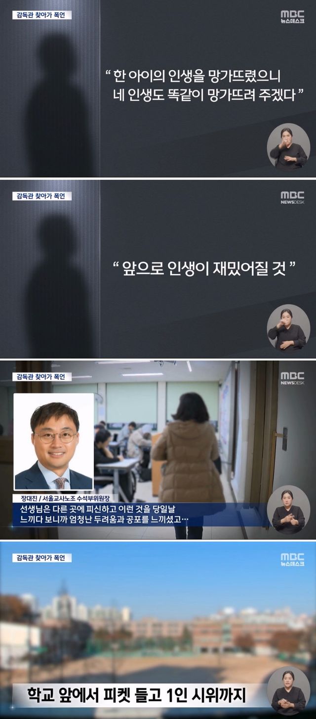 학부모는 A 씨에게 ‘1인 시위를 계속할 것이다’, ‘교직에서 물러나게 하겠다’고 말한 것으로 알려졌습니다.