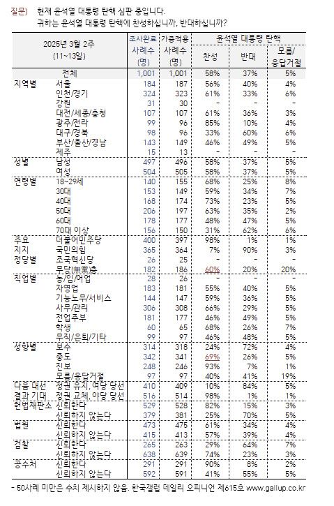 여론조사 전문기관 한국갤럽이 11~13일 실시한 조사에 따르면 윤 대통령 탄핵에 대해 응답자 중 58%가 찬성한다고 답했다. 탄핵을 반대한다는 응답자는 37%였다. 탄핵에 찬성한다는 응답자는 지난주보다 2%포인트 줄었고, 반대 비율은 2%포인트 늘었다. 지난주 구속 취소로 윤 대통령이 서울구치소에서 석방됐으나 여론 지형엔 큰 변화 없이 오차 범위 안에서 찬반 비율이 움직였다.