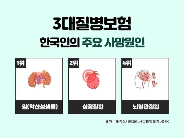 [와이뉴스] 흔히 3대질병이라 일컫는 암, 심혈관질환, 뇌혈관질환은 통계청 발표자료에 따르면 한국인의 주요 사망원인 중에서 3위 폐렴을 제외하고 1~4위를 차지하고 있으며, 이전부터 지금까지도 살면서 가장 먼저 대비해야 하는 치명적인 질병으로 강조되고 있다. 이러한 중대질병에 대비하기 위하여 상기 세가지 치명적인 질병을 집중보장하는 3대질병진단비보험을 많이 가입하고 있다. 3대진단비보험은 각각의 질병을 중점적으로 보장하면서도 가입자 특성에 맞는 특약을 추가함으로써 종합건강보험으로도 활용할 수가 있다.