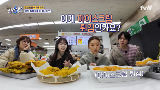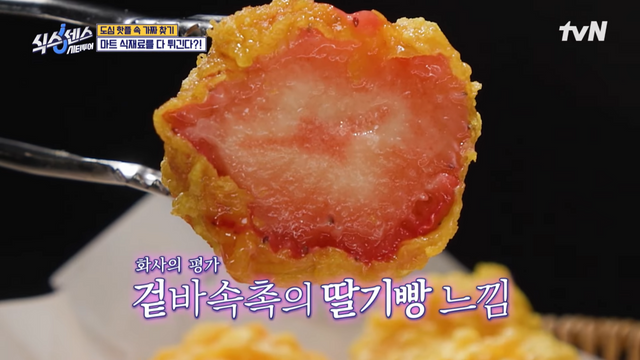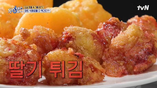 ‘신발도 튀기면 맛있다’라는 말이 있죠.기름에 튀긴 건 종류를 불문하고 무조건 맛있다는 표현입니다. 왜 하필 ‘신발’이냐면, 과거 60년대 동대문 노점에서 군화 가죽에 붙은 수구레를 떼어다 정말로 튀겨서 팔았기 때문이라는 설이 있거든요. 꽤나 인기 있었다는 후문이고요. 실제 신발은 튀길 수 없지만, 못 먹는 것 빼고 다 튀겨 준다는 가게가 있어 화제입니다. 13일 방송된 tvN 〈식스센스:시티투어〉에서 멤버들이 방문한 한 튀김 전문점 이야기에요. 이 가게는 카운터에 ‘무엇이든 튀김 해드립니다’라고 큼지막하게 적혀있으며 그 말대로 어떤 식재료든 가지고 오면 즉석에서 튀겨주는 식당이었죠. 가수 화사와 엔믹스 해원을 비롯한 멤버들은 이곳에서 주력 튀김 메뉴들을 맛보기로 했습니다. 양념갈비 튀김, 삼겹살 튀김, 아이스크림 튀김, 초코파이 튀김과 함께 화사와 유재석이 관심을 가진 딸기 튀김, 카스텔라 튀김도 주문했네요. 해원은 “대전 성심당에 파는 튀김 소보로 느낌이겠다”라고 말하며 기대감을 드러냈어요.