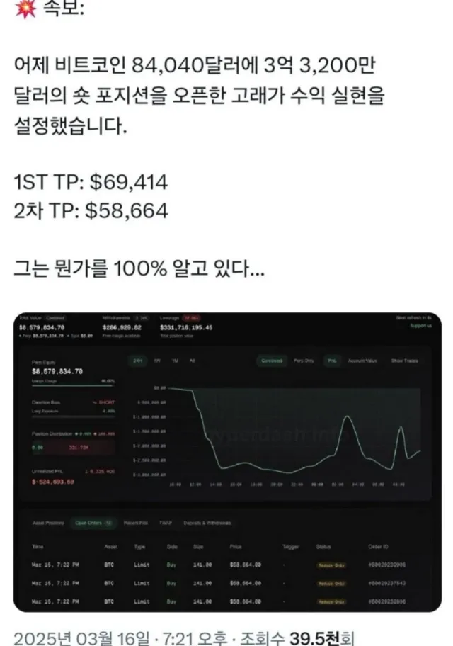1. 일명 '트럼프내부자 고래'로 알려진 지갑이 오늘도 하이퍼리퀴드에서 84000에 대규모 숏포지션 오픈