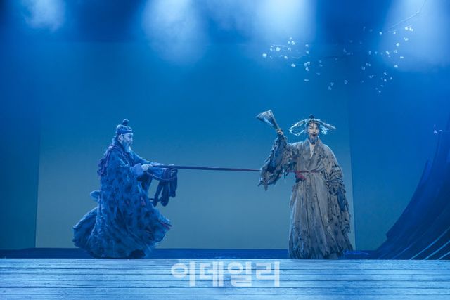 지난 13일 국립극장 달오름극장에서 개막한 국립창극단 신작 ‘보허자(步虛子): 허공을 걷는 자’의 한 장면. 형 수양의 권력욕으로 죽음을 맞이해야 했던 동생 안평이 자신의 비극을 마치 제3자의 이야기인양 나직이 읊조리다 웃음을 짓는다. 폐허와 같은 적막한 무대 위, 안평을 비추는 은은한 조명이 보는 이의 마음을 처연하게 만든다.