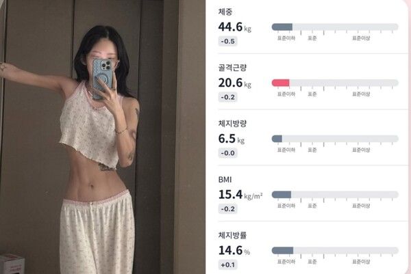 공개된 사진 속 최준희는 크롭 파자마를 입고 거울 셀카를 찍고 있다. 한눈에 봐도 초슬렌더 몸매에 탄탄한 복근까지 드러낸 최준희는 체성분분석 결과 체중 44.6kg, 체지방률은 표준 이하인 14.6%임을 공개해 눈길을 끌었다. 꾸준한 다이어트로 자기관리 아이콘이 된 최준희의 모습에 네티즌들은 "너무 멋있어요", "복근 무슨 일" 등의 댓글을 달고 있다.