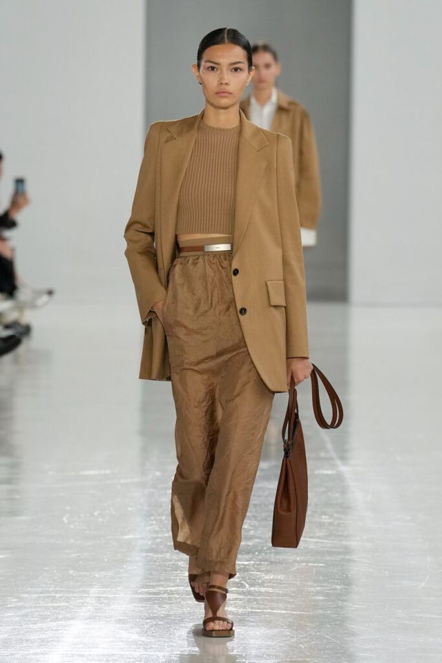 FAVORITE LOOK 어깨에 좁은 삼각 형태로 주름을 잡은 포플린 셔츠에 캐멀 컬러 마이크로 팬츠를 매치한 룩
