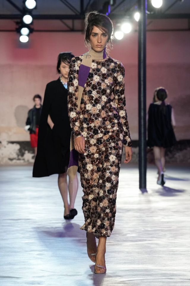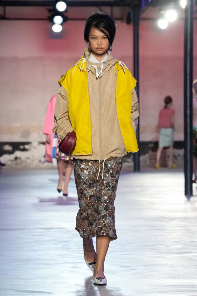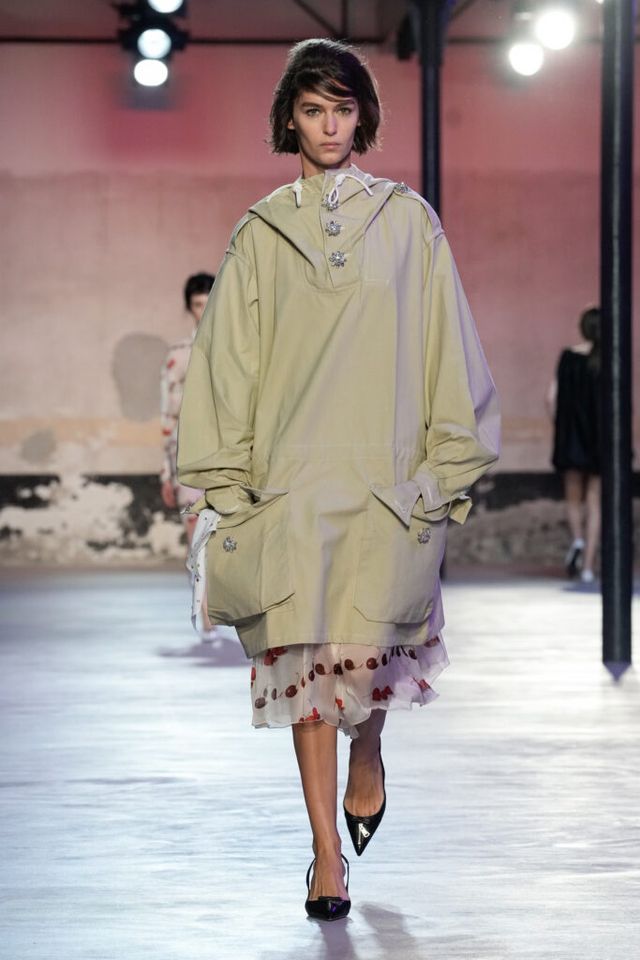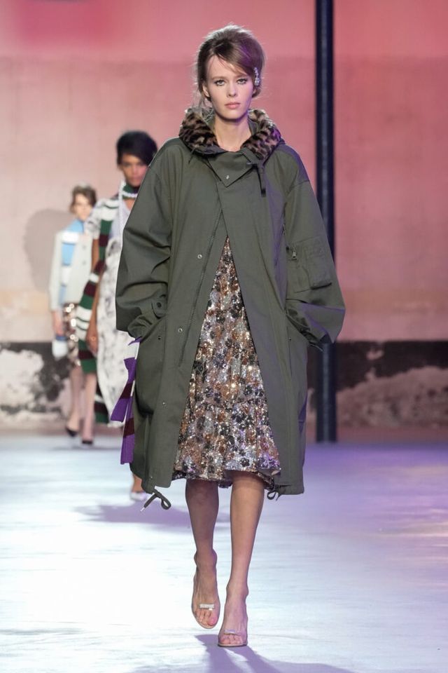 FAVORITE LOOK 사파리 재킷과 시퀸 드레스를 조합한 오프닝 룩. 값비싼 수트를 보호하기 위해 피시테일 파카를 걸쳤던 과거의 모즈족을 보는 듯했다.