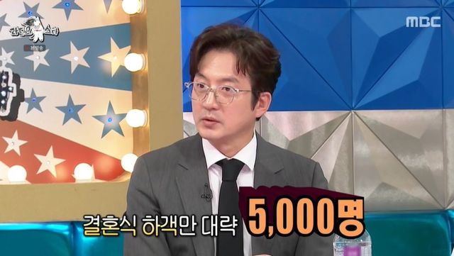 정준호는 엄청난 규모의 결혼식에 대해서도 밝혔다. 그는 “두바이 왕자 가문, 몽골 국방부 장관, 미국 고위급 간부들이 오셨다. 하객만 5,000명 정도 오셨다. 대형 호텔에서 했는데, 모든 공간을 다 썼다”고 밝혔다. 김구라가 “식대가 3~4억 나왔겠는데?”라고 놀라자 정준호는 “그렇게 나왔다”며 연예계 대표 마당발임을 인정했다.