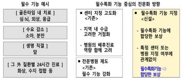 이에 정부는 ▲골든타임 내 치료(심·뇌, 외상, 응급) ▲수요 감소(소아, 분만) ▲암 진료 ▲24시간 진료 분야 등 필수특화기능을 지정하고 필수특화 수행 여부와 역량에 따라 보상하는 ‘필수특화 기능 보상(가칭)’을 도입한다. 여기에는 연간 약 1000억원 이상의 재정을 투입한다는 계획이다.