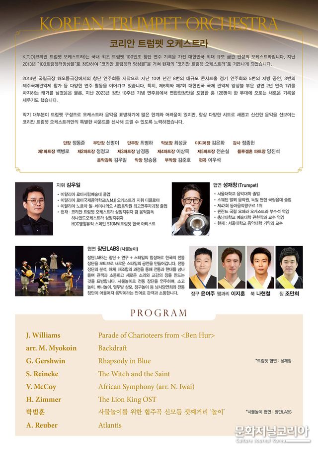 트럼펫을 중심으로 금관의 힘과 섬세함을 모두 담아내는 코리안 트럼펫 오케스트라의 이번 무대는 관객들에게 잊지 못할 감동을 선사할 것으로 기대된다.