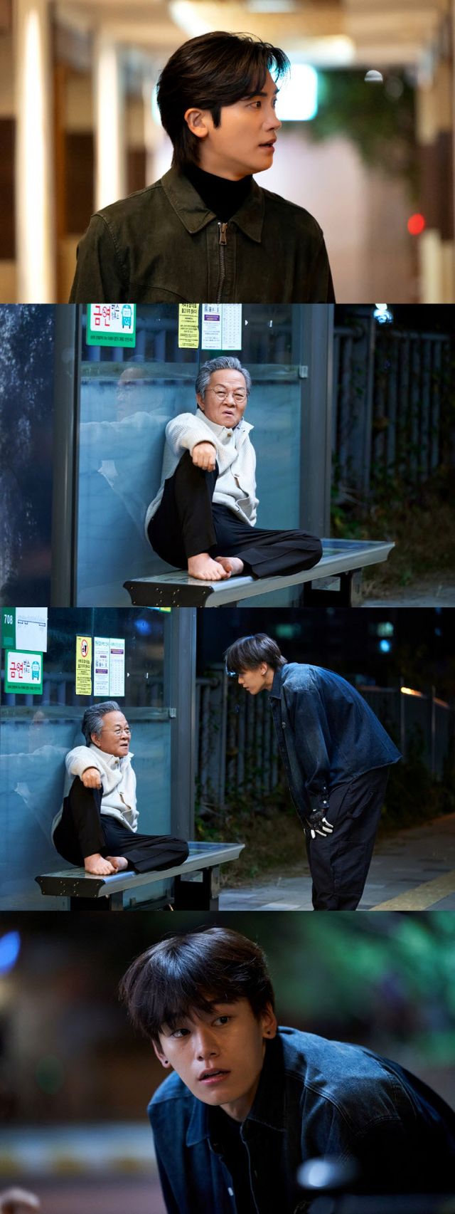 다음 사진에서는 차강천 앞에 지선우가 서 있다. 지선우는 아직 차강천이 자신의 친부라는 사실을 모르는 상황. 몇 번 마주친 것이 전부인 차강천이 길을 잃은 것을 발견한 지선우가 어떻게 반응할지 궁금하다. 당황한 것 같지만 다정하게 차강천에게 다가서는 지선우의 모습이 ‘피가 끌린다’는 느낌을 준다.