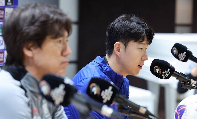 대한민국 축구대표팀 홍명보 감독(왼쪽)과 손흥민이 지난 19일 오후 경기 고양시 고양종합운동장에서 오만전 관련 기자회견을 하고 있다. 홍명보 감독이 이끄는 축구대표팀은 오는 20일 고양종합운동장에서 오만과 2026 FIFA 북중미 월드컵 아시아 지역 3차 예선 B조 조별리그 7차전을 치른다 / 뉴스1