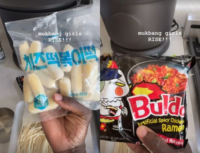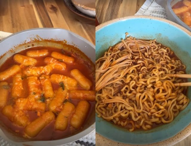 그는 완성된 떡볶이와 팽이버섯을 넣은 불닭볶음면, 김과 김치까지 옆에 두고 식사를 할 것을 예고했다.