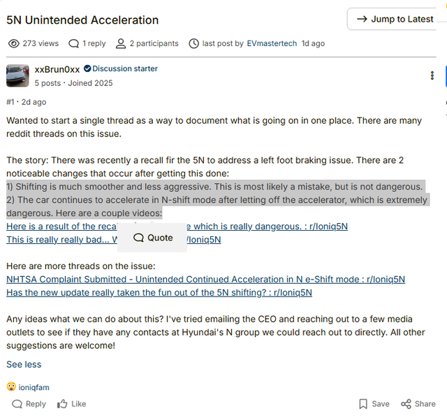 그러나 리콜 후 일부 차주들은 “기존 문제는 해결됐지만, 예상치 못한 급가속 문제가 추가로 발생했다”라고 주장하고 있다. 한 차주는 자동차 관련 온라인 커뮤니티 ‘아이오닉포럼’에서 “N-시프트 모드에서 가속 페달을 떼도 속도가 줄지 않는다. 매우 위험한 상황”이라고 지적했다.