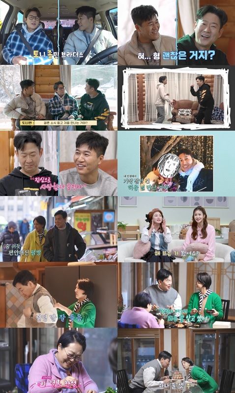 모처럼 토니안과 만난 김종민은 차를 타고 경기도 양평으로 향했다. 양평에 사는 천명훈을 만나 ‘청모’를 하기로 한 것인데, 차 안에서 김종민은 “혹시 형님은 여자친구가 있느냐?”고 슬쩍 물었다. 토니안은 “여자친구는 없는데 이제 결혼을 생각하는 시기는 온 거 같다”고 답했다. 그는 “배윤정과 아카데미를 하고 있는데, 학원에 다니는 아이들을 보면 너무 귀여운 거다. 그래서 결혼을 생각하게 됐다”고 밝혔다. 그러면서 “너까지 간다고 하니 더욱 압박이 된다. 나도 50세 전에는 가야 할 것 같다”고 부담감을 털어놨다. 잠시 후 두 사람은 천명훈의 집에 도착했다. 천명훈은 김종민을 보자 “소식 들었다. 눈물이 날 것 같다”며 축하 인사를 건넸다. 김종민은 “형들에게 좋은 기운을 주고 싶다”고 화답한 뒤 청첩장을 전했다. 토니안은 “원래 절대 축가를 안 부르는데, 미리 축가를 해주겠다”며 마이크를 잡았고, 다음으로 천명훈이 “사실 종민이 결혼 소식을 듣고 편지를 준비했다”며 축사를 낭독했다. 그는 “막상 올 게 왔다고 하니까 잘 믿기지 않았다. 네가 자랑스러우면서도 부러웠다. 미래의 와이프와 함께 잘 살 거라고 믿는다”고 하면서 눈시울을 붉혔다.