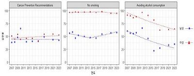 - 장기간에 걸친 암 예방 수칙 실천율 변화 추세를 Joinpoint 회귀분석을 이용하여 분석하였으며, 각 시점에서의 암 예방 수칙에 대한 실천율 변화량과 장기적인 추세의 방향을 정량적으로 제시함. - (전반적인 암예방 수칙) 여성은 실천율이 증가하는 추세, 남성은 뚜렷한 추세를 보이지 않음. - (금연 실천율) 여성은 높은 실천율과 안정적인 추세를 보여주나 통계적 유의하지 않음. 남성은 2007-2014년 동안 연 2.4% 감소하는 추세를 보였으나, 2014-2023년 동안 연 2.6%로 증가하며 통계적으로 유의함. - (금주 실천율) 여성은 남성보다 높은 실천율을 보여주지만 2007-2023년 동안 연 2.6% 감소 추세이며, 남성은 2007-2023년 동안 연 5.0% 감소하여 여성보다 높은 변화율을 보여줌. |