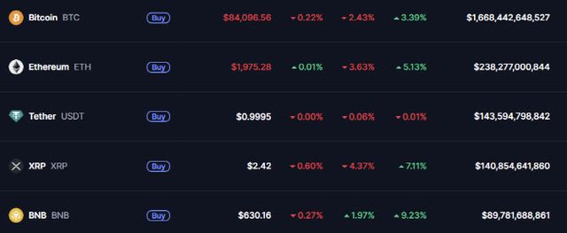 21일 글로벌 가상자산 시황중계 사이트 코인마켓캡에 따르면 이날 오전 8시 기준 비트코인 가격은 24시간 전 대비 2.43% 내린 8만 4096달러를 기록했다. 같은 기준 알트코인(비트코인 외 가상자산)의 대표격인 이더리움도 전일 대비 3.63% 하락한 1975달러에 거래됐다.