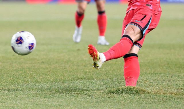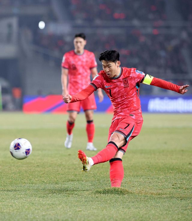 20일 오후 경기 고양시 고양종합운동장에서 열린 2026 국제축구연맹(FIFA) 북중미 월드컵 아시아 3차 예선 B조 7차전 대한민국과 오만의 경기에서 대한민국 손흥민이 센터링하고 있다. 손흥민 디딤발에 잔디가 밀리고 있다. / 뉴스1