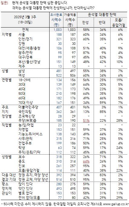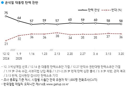 여론조사 전문기관 한국갤럽이 18~20일 실시한 조사에 따르면 윤 대통령 탄핵에 대해 응답자 중 58%가 찬성한다고 답했다. 탄핵을 반대한다는 응답자는 36%였다. 탄핵에 찬성한다는 응답자는 지난주와 같았고 반대한다는 응답자는 1%포인트 줄었다. 이 회사 조사에서 탄핵 찬성 비율은 1월 초 이후 57~64%, 반대 비율은 32~38% 범위 안에서 움직이고 있다.
