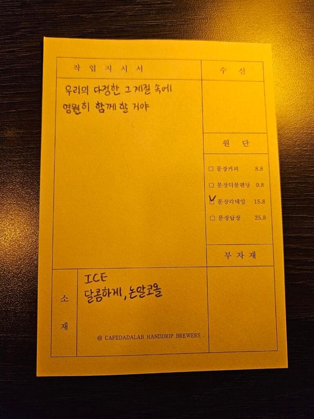 그래서였을까? 인터넷 서치를 하다 문장으로 음료를 커스텀해주는 카페가 있다는 이야기를 접했을 때, 단번에 마음을 빼앗기고 말았다. 단순히 음료를 파는 곳이 아니라, 문장을 맛으로 번역해 주는 공간이라니!