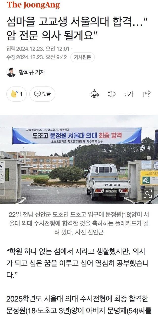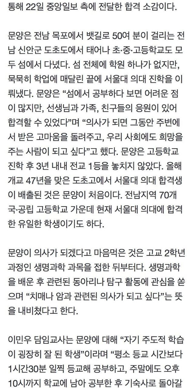 육지와 연결된 다리 하나 없는 섬마을 고등학교에서 서울대 의대 합격