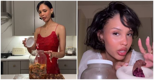 나라 스미스가 직접 김치를 만드는 영상을 캡처한 사진(왼)과 나라 스미스가 자신의 SNS에 올린 영상에서 김치와 오븐에 구운 고구마를 직접 먹는 모습(오) / 나라 스미스 SNS