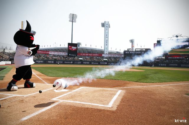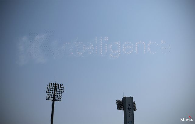 다른 구단과 달리 KT는 뚝심 있게 구단 전통의 무인 시구를 진행했다. 벌써 역대 10번째다. 이번 개막전 시작 15분 전 시작되는 이번 시구 행사에는 총 350대의 드론이 동원된다. 이들은 KT위즈파크 옆에 위치한 수원 종합운동장의 2개 조명 사이에서 날아올라 불꽃으로 K intelligence(KT AI 브랜드) 글자를 만들 예정이다. 이후 양쪽 폴에서 출발한 야구공 모형이 중앙 전광판에서 홈플레이트로 향하는 라인 로켓 시구 진행한다. AICT 기업답게 야구단과 함께 시너지를 내는 게 이번 행사의 핵심이다.