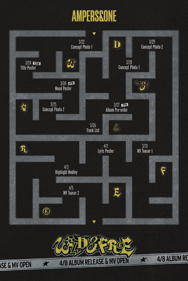 공개된 타임테이블에는 앰퍼샌드원이 새 앨범 ‘와일드 앤 프리’를 찾아가는 미로가 담겨있다. 앰퍼샌드원은 22일 첫 번째 콘셉트 포토를 시작으로 타이틀 포스터, 무드 포스터, 트랙리스트, 뮤직비디오 티저 등 다양한 콘텐츠를 공개하며 앰퍼샌드원만의 길을 개척해 나갈 예정이다.