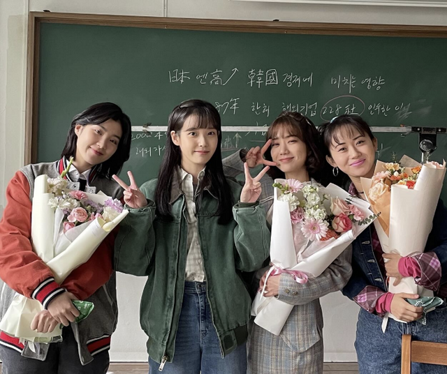 사진 속에는 순차 공개 중인 넷플릭스 시리즈 ‘폭싹 속았수다’의 여름 테마 2막 비하인드 현장이 담겨있다. 아이유는 자신이 1인 2역으로 연기한 애순의 딸 금명의 십대시절부터 이십대까지 분장을 하고 출연진과 포즈를 취하고 있다.