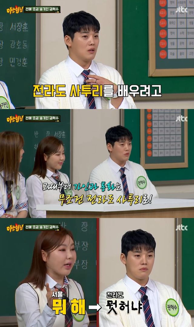 권혁수는 "사투리 콘텐츠를 하려니 도움받을 사람이 없더라. 가인이랑 전화할 때 무조건 전라도 사투리를 쓴다. 덕분에 콘텐츠도 잘 됐다"며 송가인에 고마운 마음을 전했다.