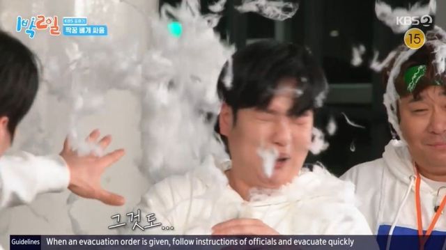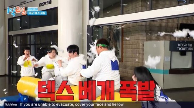이후 짝꿍 베개 싸움으로 붙은 딘딘&덱스, 문세윤&한해. 대결이 도중 덱스 베개가 터져 현장은 초토화가 됐다. 덱스는 “이게 왜 터져”라고 당황했고, 이후 순식간에 벌어진 사고로 결국 탈락했다.