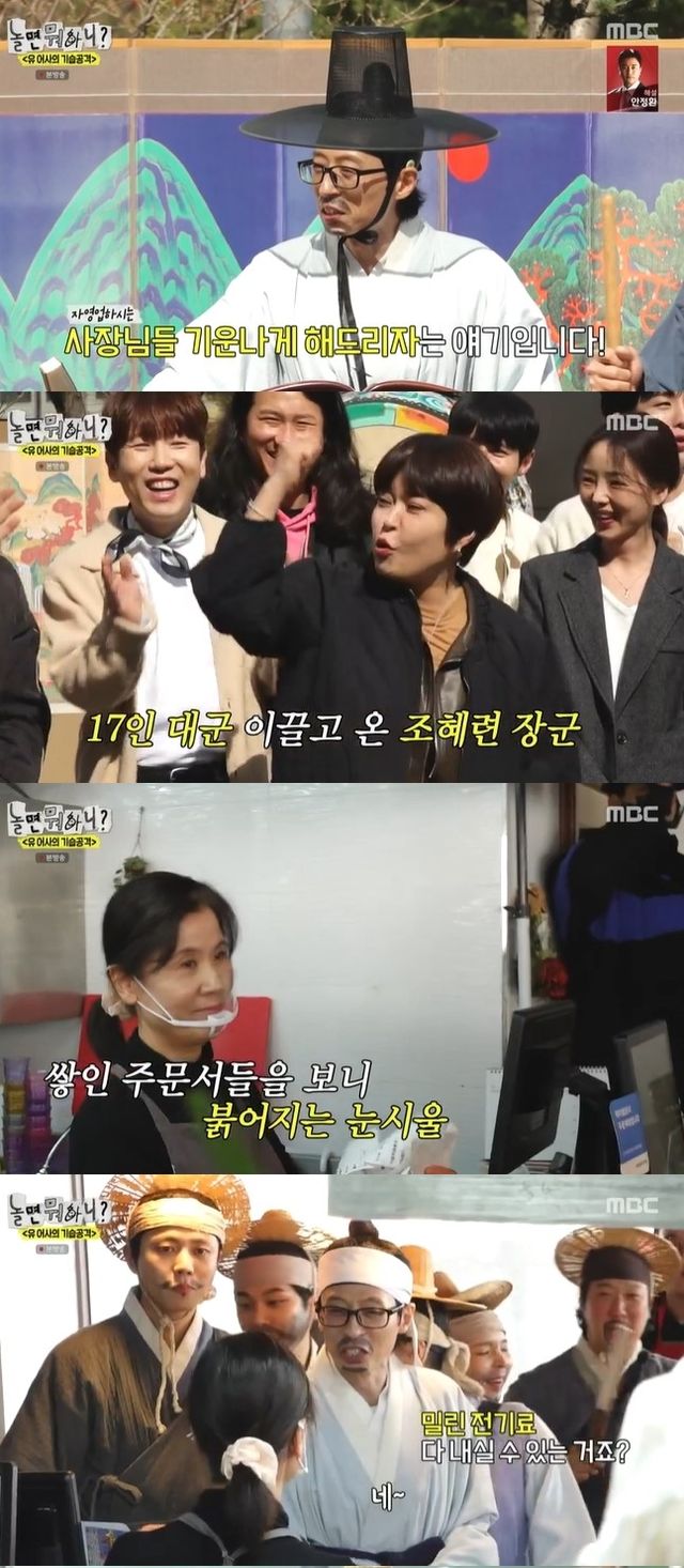 유 어사는 “오늘 자영업자 사장님들 기운 나게 해드리자”라면서 ‘기습 공격’ 출정식을 열었다. 16년 전 박명수의 ‘기습 공격’에 함께했던 원년 멤버 조세호, 남창희가 힘을 보탰다. 조혜련은 천군만마 같은 대군 연극 ‘사랑해 엄마’ 팀을 이끌고 왔다. 여기에 공복으로 무장한 임우일, 딘딘, 파트리샤 등이 합류해 든든함을 더했다.