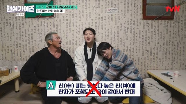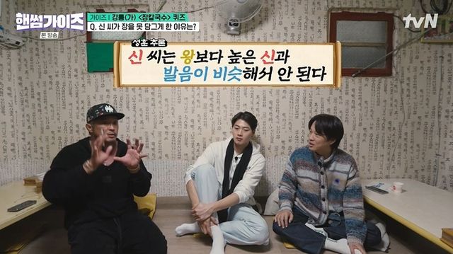 가이즈 팀은 퀴즈로 ‘신 씨가 장을 못 담그게 한 이유’를 맞혀야 했다. 오상욱은 “여기 클래스면 그냥 실 것 같아서인데”라고 밝혔다. 추성훈은 “하늘의 신과 발음이 같지 않냐. 왕보다 높으면 안 되니까”라며 한자를 쓰다가 정답이 맞다고 확신했고, 차태현도 “‘매울 신’보다 훨씬 낫다”고 밝혔다. 추성훈은 “여기서 내가 맞으면 다음에 부르지 마”라고 말해 웃음을 안겼다.