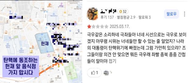 온라인상 사용자들은 좌파 식당이 헌재 앞 탄핵 반대 시위대를 비난했다거나 탄핵에 찬성한다는 이유로 불매하자고 주장하고 있었다. 해당 가게 점주들은 그러한 사실이 없는데도 윤 대통령 지지자들이 찾아와 항의하고 전화로 대뜸 욕을 하는 사람도 있다고 호소했다.