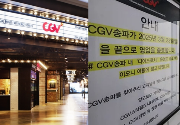 국내 대표 멀티플렉스 영화관인 CGV가 수익성 악화를 이유로 서울 송파구 문정동의 ‘CGV 송파’와 인천 연수구 청학동의 ‘CGV 연수역’ 영업을 2025년 3월 23일부로 종료한다.