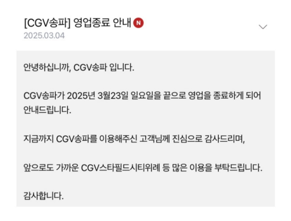 CGV는 지난 4일 홈페이지 공지를 통해 “CGV 송파가 2025년 3월 23일 일요일을 끝으로 영업을 종료하게 되어 안내드린다”며 “앞으로도 가까운 CGV 스타필드시티위례 등 많은 이용을 부탁드린다”고 밝혔다.