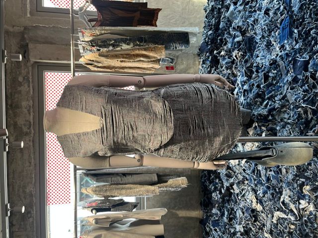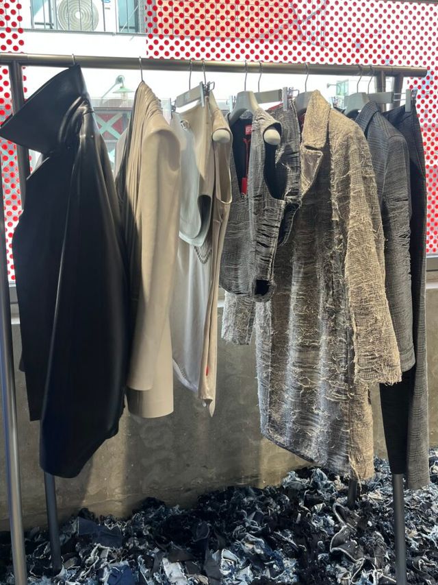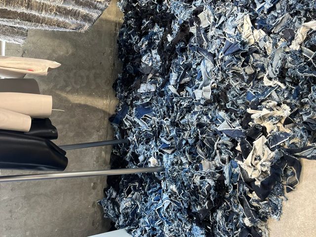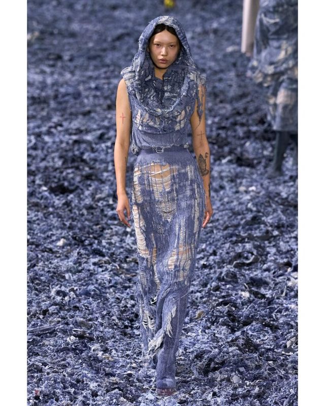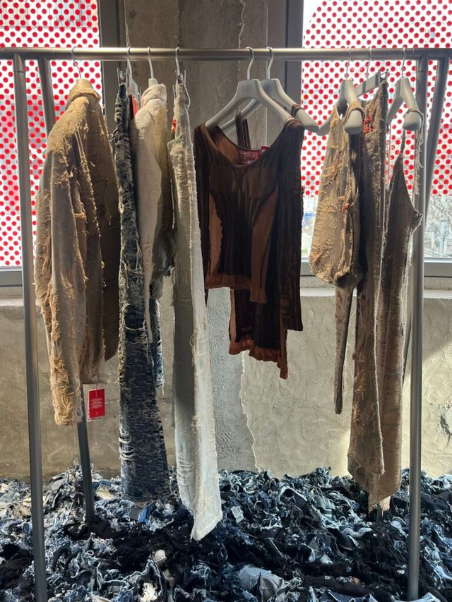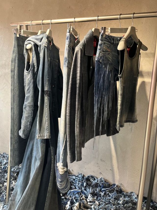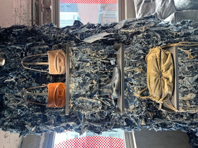 조각조각 땃따따! 데님 조각들로 가득한 이 곳은! 디젤의 2025 S/S 컬렉션 프레젠테이션 현장입니다. 바닥에 늘어져있는 데님 자투리들은 패션쇼의 베뉴에서 사용했던 것으로 버려진 원단을 재활용했다고해요.