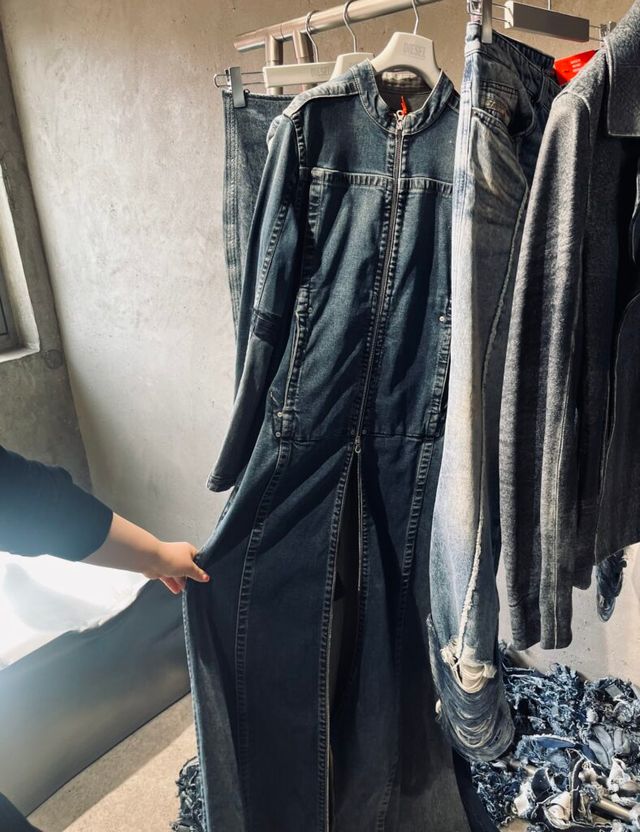 바닥까지 내려오는 몽크 코트는 디젤 자체 데님 생산에서 발생된 자투리를 사용한 100% 재활용 코튼으로 제작했습니다. 매 시즌 새로운 차원의 데님을 보여주는 디젤. 역시 데님하면 디젤, 디젤하면 데님이네요.