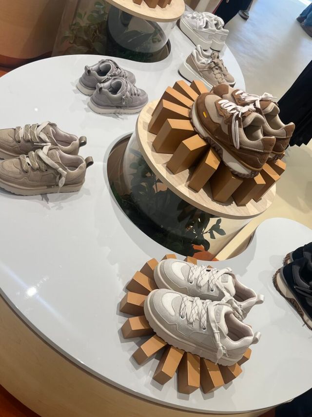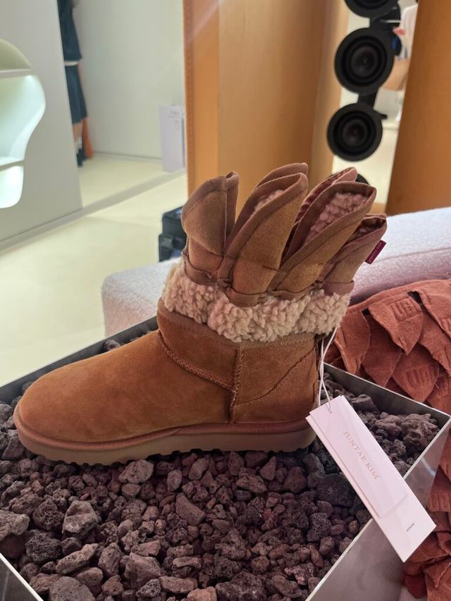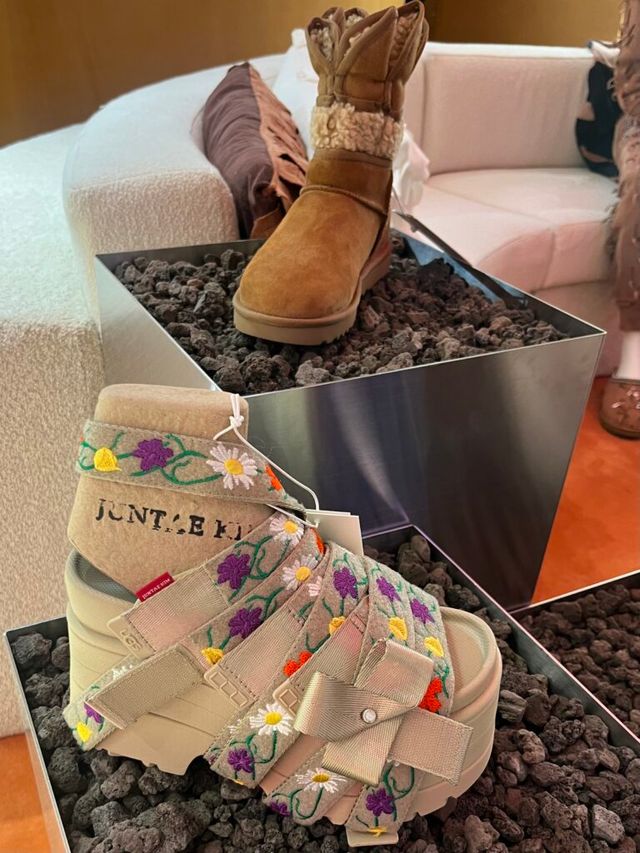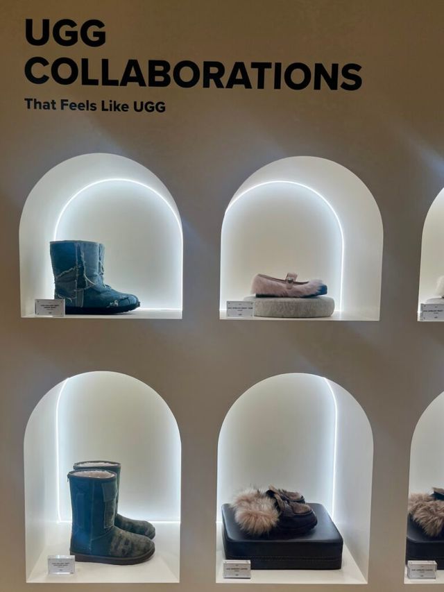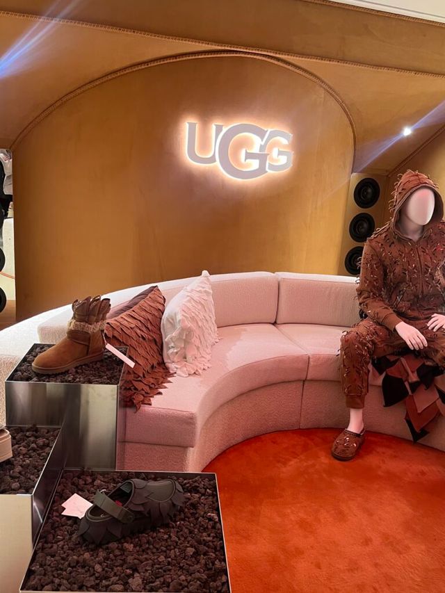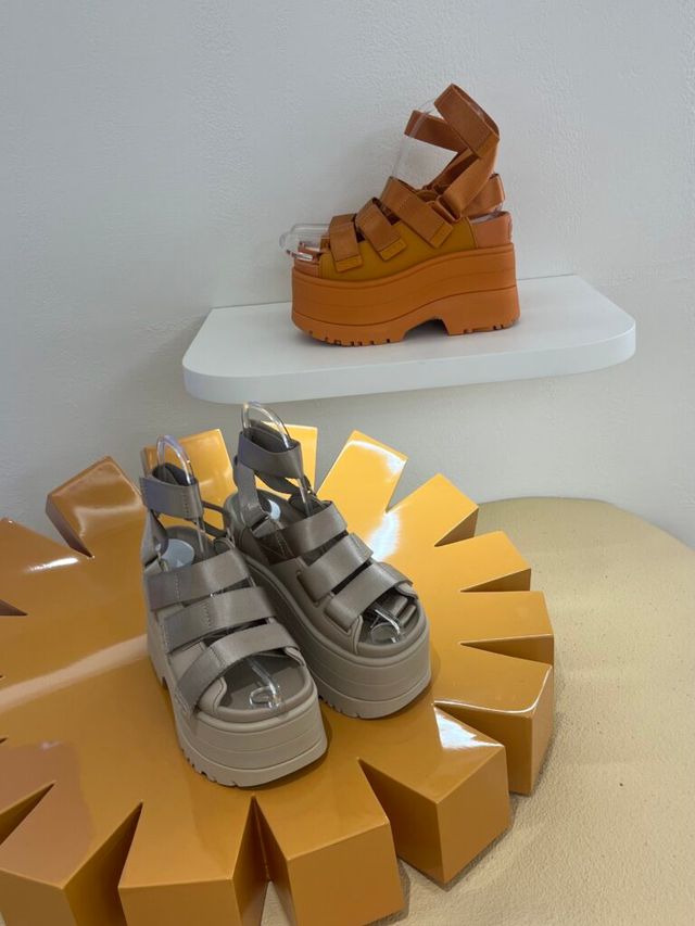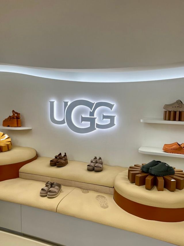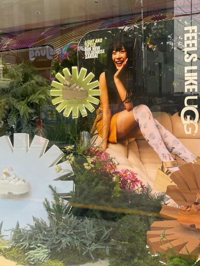 매장 밖에서 볼 수 있는 캠페인 이미지 속 하니가 신은 골든 라이즈 하이 플랫폼 샌들부터 골든 스타 클로그, 골든스타 글라이드 등. 어그 신상 총집합이에요.